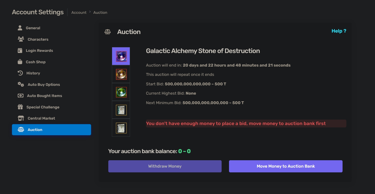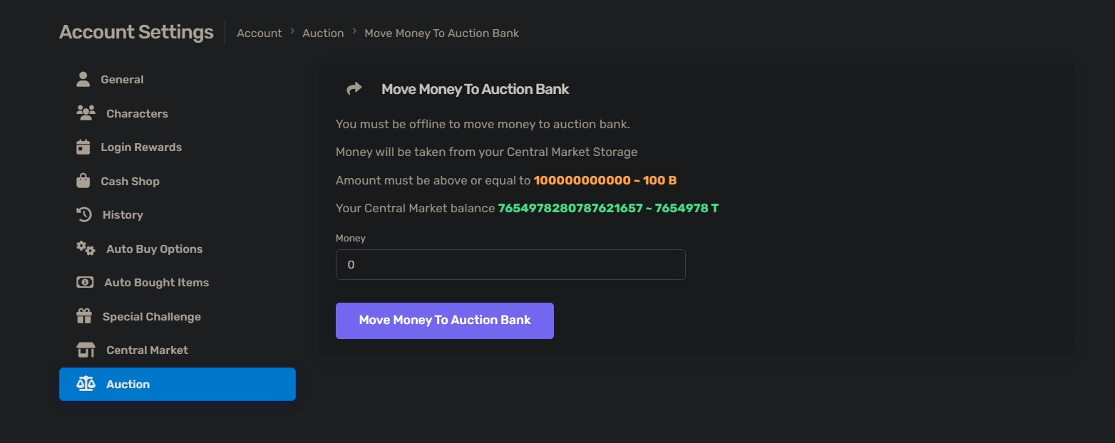 You can move money to Auction Bank from your Central Market Storage and vice versa. You have to be offline or in character screen to move money
